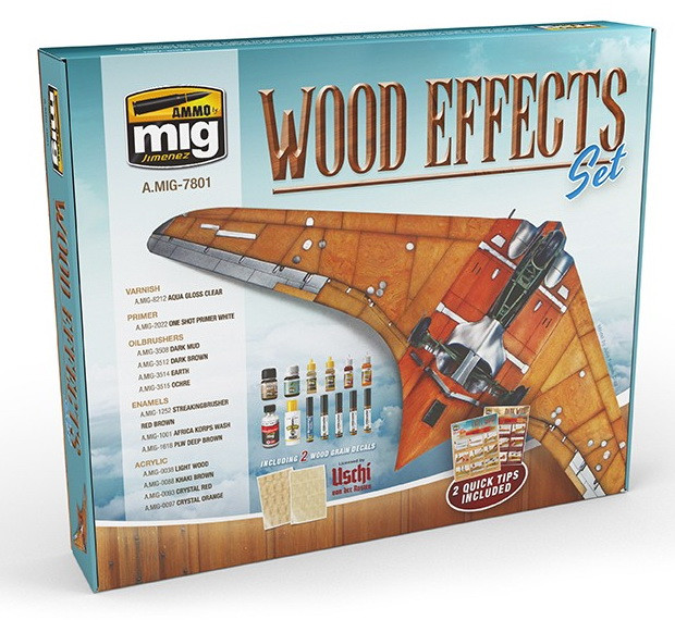WOOD EFFECTS SET contains all the material necessary for authentically replicating natural wood surfaces including 2 different highly realistic wood grain decals from Uschi van der Rosten. This complete set provides the materials required including base colour, wood grain decals, washes, and streaking effects. The product range is accompanied by detailed step-by-step instructions used to quickly apply the different techniques to accurately create all wood types for an infinite range of subjects and purposes.