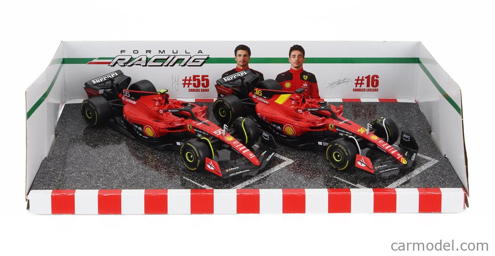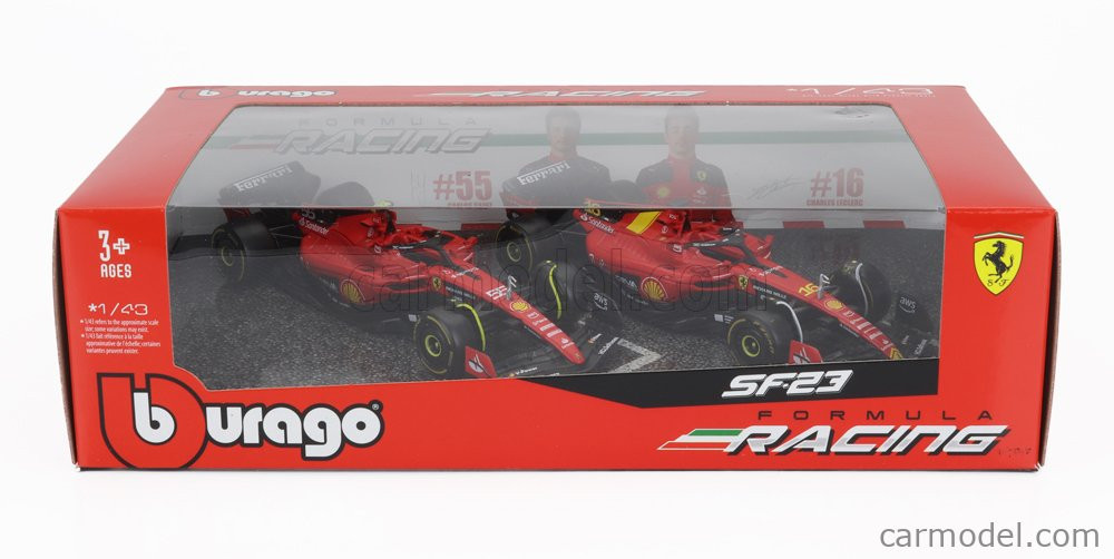Burago FERRARI SET F1 2X SF-23 TEAM SCUDERIA FERRARI N 16 SEASON 2023 CHARLES LECLERC + N 55 SEASON 2023 CARLOS SAINZ