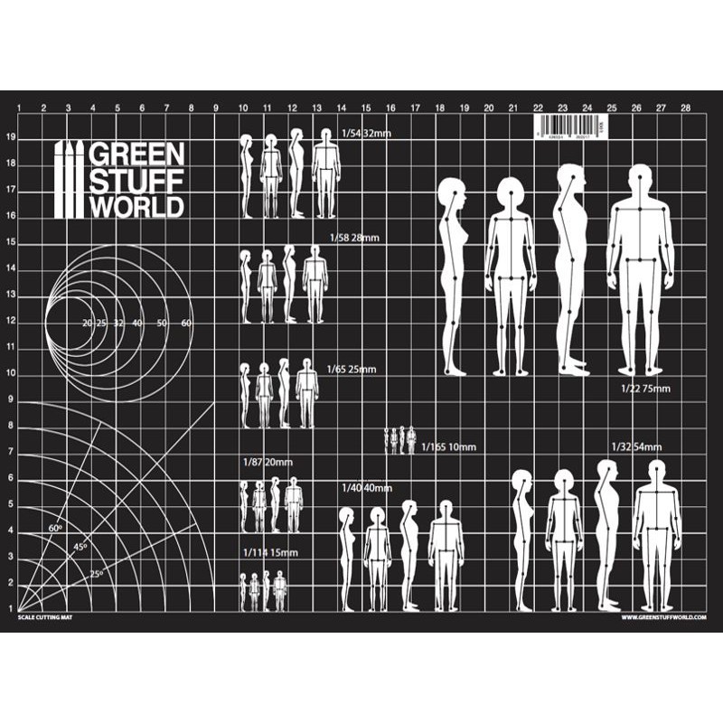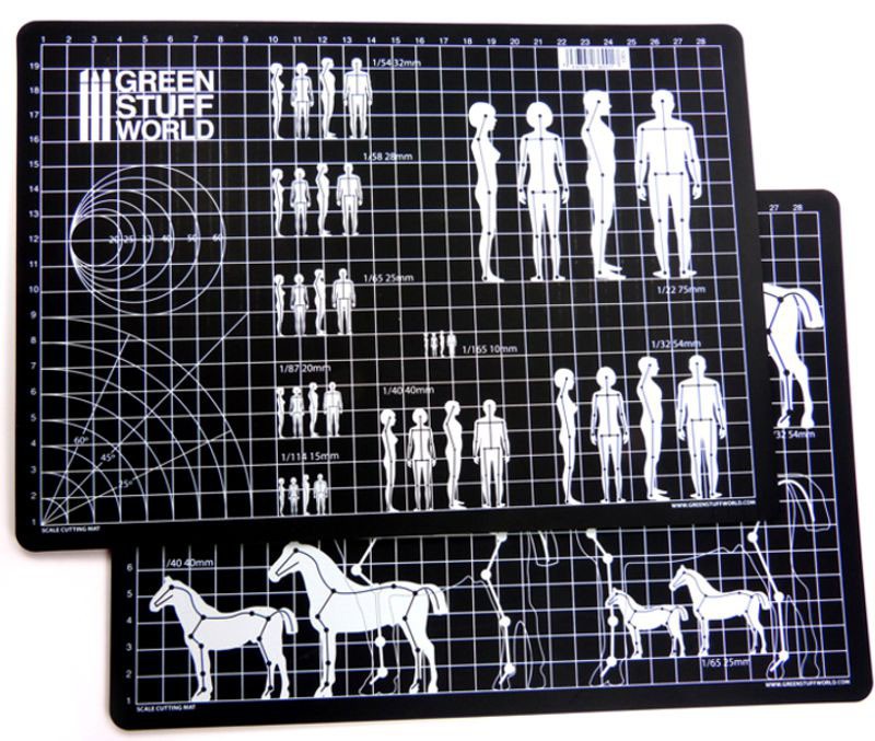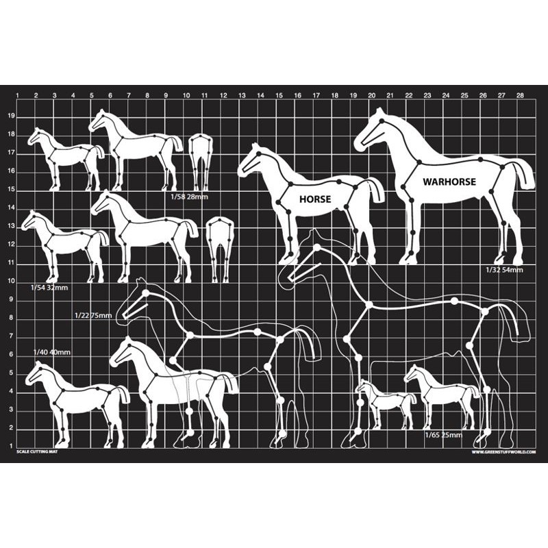 On one side of the Mat are printe the guide lines of the most common scales, which will allow you to create armatures for sculpting miniatures of both men and women. On the other side you will finde the same scales and guide lines to create horses and warhorses armatures