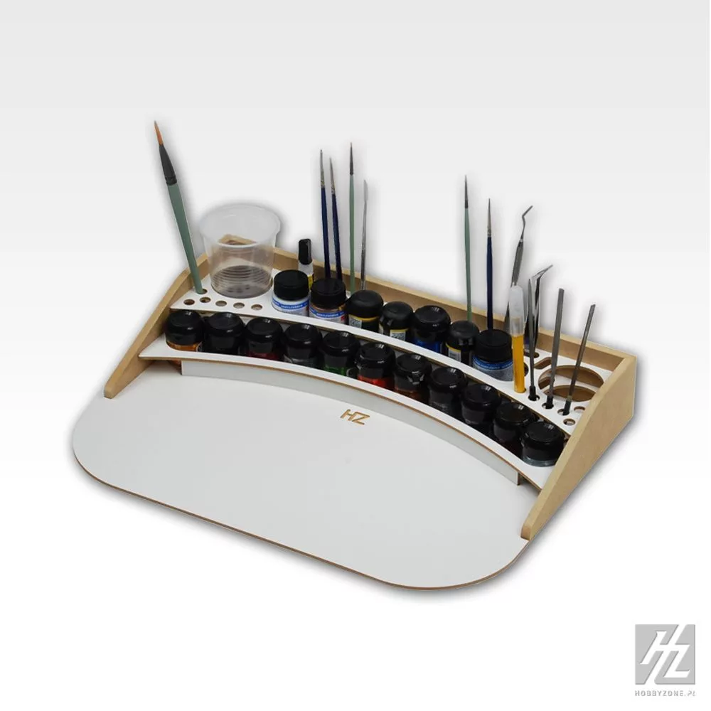 Az állványon ezen kívül számtalan különböző átmérőjű furat található ecsetek és különféle kiegészítők (fúrófejek, pipetták, fogók, reszelők) biztonságos tárolásához.