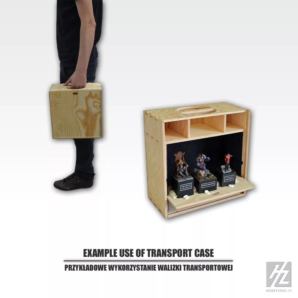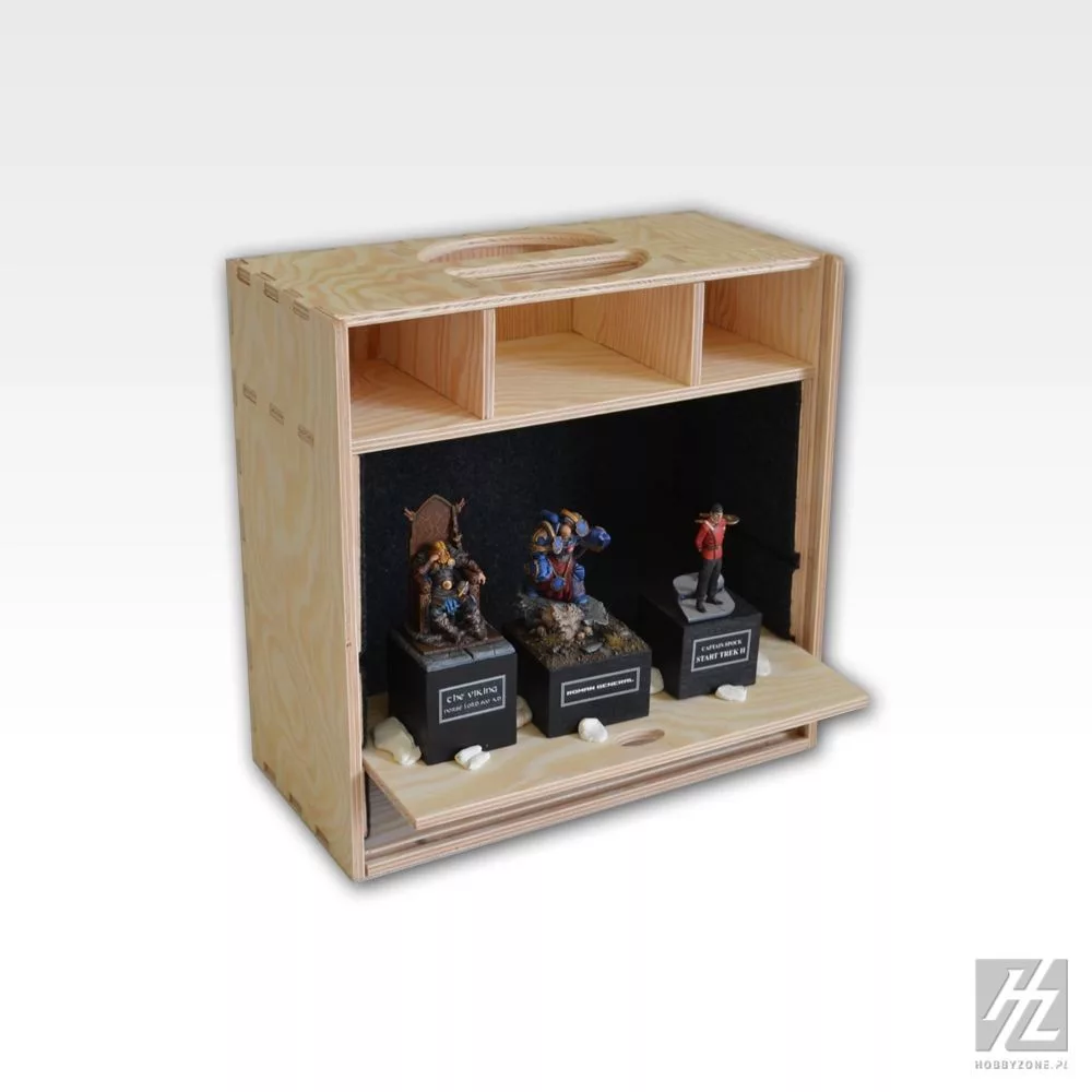 Makettek, festékek és szerszámok biztonságos szállításához. Állítható polcokkal.