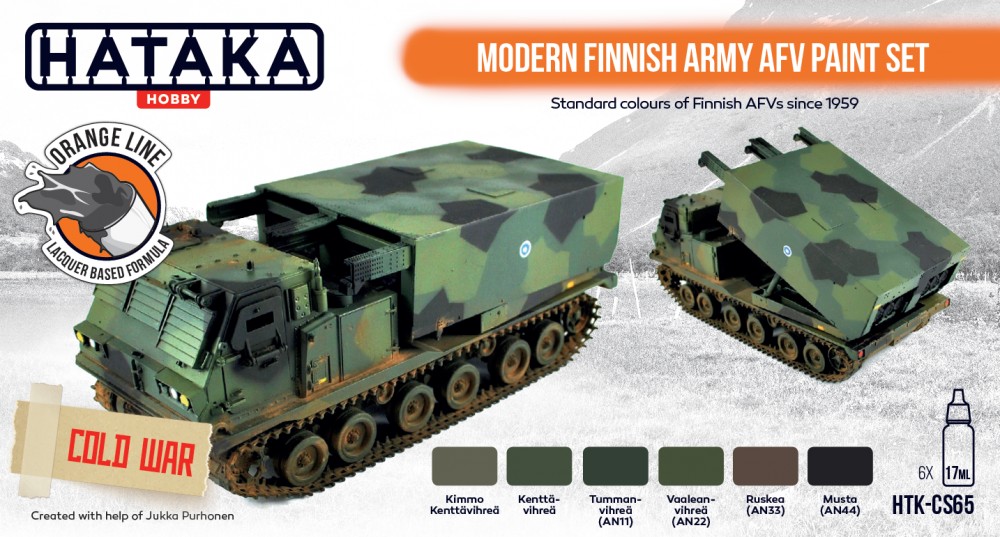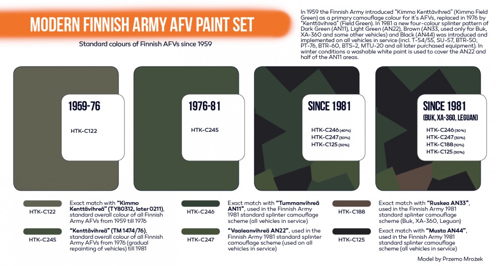 HTK-C246 – Dark Moss Green (FS14077, AN11) – Exact match with „Tummanvihreä AN11”, used in the Finnish Army 1981 standard splinter camouflage scheme (all vehicles in service)