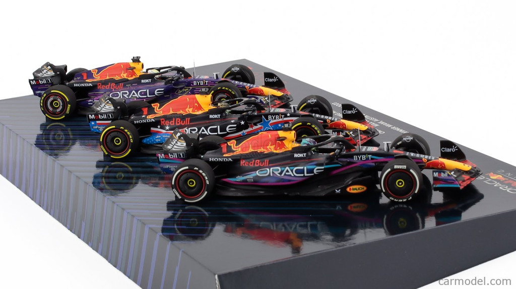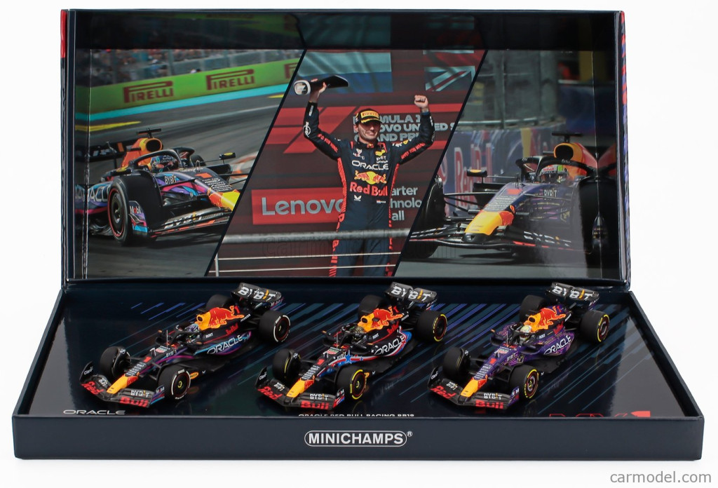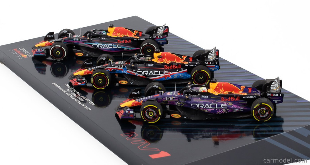 Minichamps RED BULL F1 SET 3X RB19 TEAM ORACLE RED BULL RACING N 1 WORLD CHAMPION WINNER MIAMI - LAS VEGAS - AUSTIN USA GP 2023 MAX VERSTAPPEN