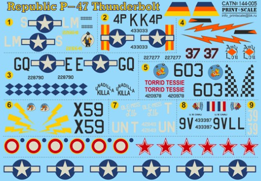 1. Republic Thunderbolt P-47D-25-RA, flown by Col David Schilling, 62nd FS, 8th AF, Boxted, England, 1944. Camouflage Dark Sea Gray/Dark Green is put on over natural metal (upper surfaces). Red nose band and yellow rudder. Black/White invasion stripes around wings and rear fuselage.