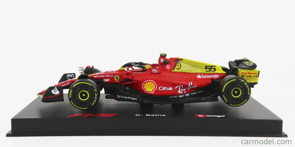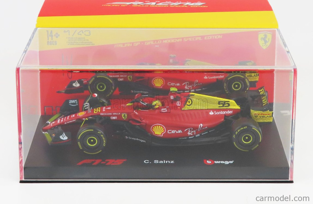 Burago FERRARI F1-75 SCUDERIA FERRARI N 55 4th MONZA GP ITALY 2022 CARLOS SAINZ - WITH HELMET AND PLASTIC SHOWCASE - EXCLUSIVE CARMODEL