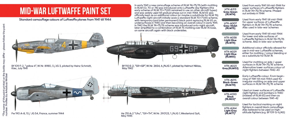 In early 1941 a new camouflage scheme of RLM 74+75/76 (with mottling in RLM 02, 70 or 74) was introduced onto Luftwaffe day fighters (the early scheme of RLM 70+71/65 remained in use on other aircraft types) and was widely used till gradual phase out in mid-1944. RLM 65 was officially kept as an additional colour (or maybe a substitute for RLM 76). Luftwaffe night aircraft initially wore a standard RLM 70+71/65 scheme, with temporary (and later permanent) black paint replacing RLM 65 on undersurfaces in 1940 and then becoming an overall colour in early 1941. In 1942 the RLM 74+75/76 scheme was introduced onto night aircraft, later simplified to a combination of RLM 75 mottling over RLM 76 base, on some aircraft again with black undersides.