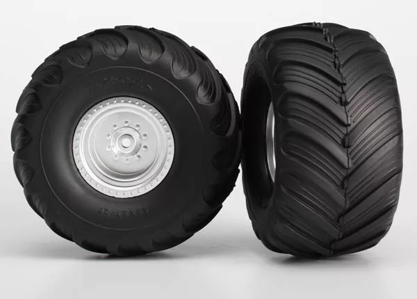 Traxxas Tires & wheels, assembled, glued (satin chrome wheels, Terra Groove dual profile tires, foam inserts) (2WD electric rear) (2)