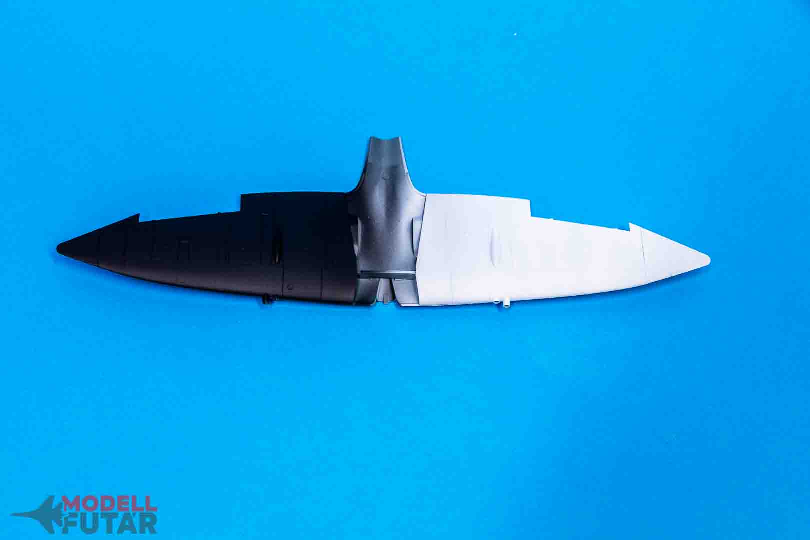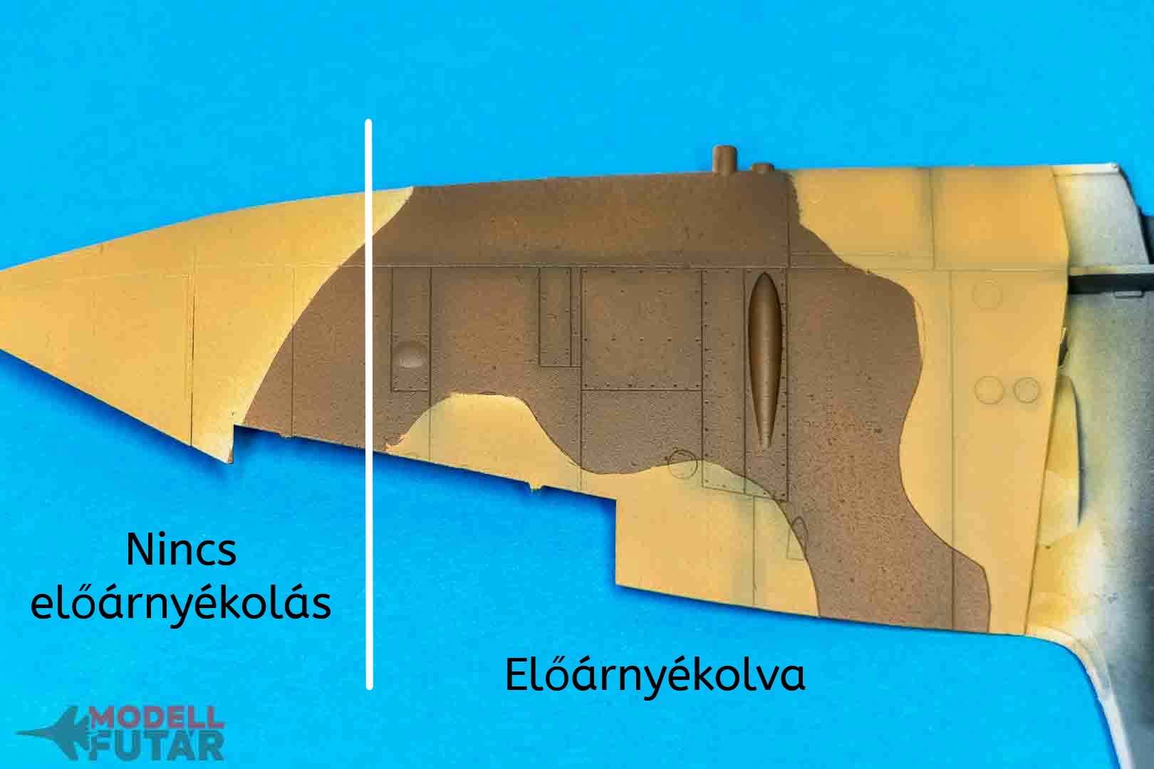 Ha nem muszáj, ne használjunk fekete festéket előárnyékolásra. Egy sötétebb szürke, vagy egy sötétebb barna szín bőven elég. Sajnos a fekete előárnyékolásra nagyon sok festéket kell felfújni, mire eltakarja annyira, hogy szép legyen. A szürke és a barna festék könnyebben befedhetők. De miért barna? Nos, majd lesz színelmélet „oktatás” is, abban bővebben kifejtjük majd ezt a jelenséget, de most legyen elég annyi, hogy a legtöbb kamó a repülőkön, harci járműveken a sárga-barna-zöld kombinációja. És a barna festék mindegyikkel kapcsolódik, hiszen a barna szín kikeverhető a három fő színből. Erről is beszélünk majd a színelmélet órán.