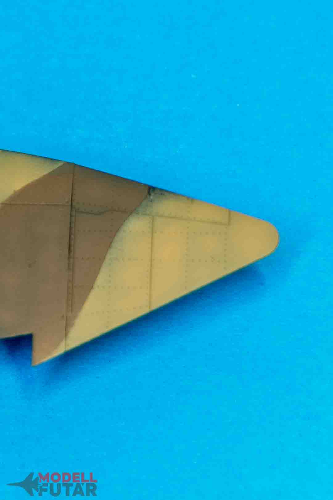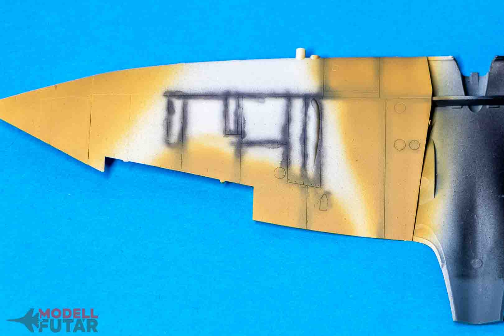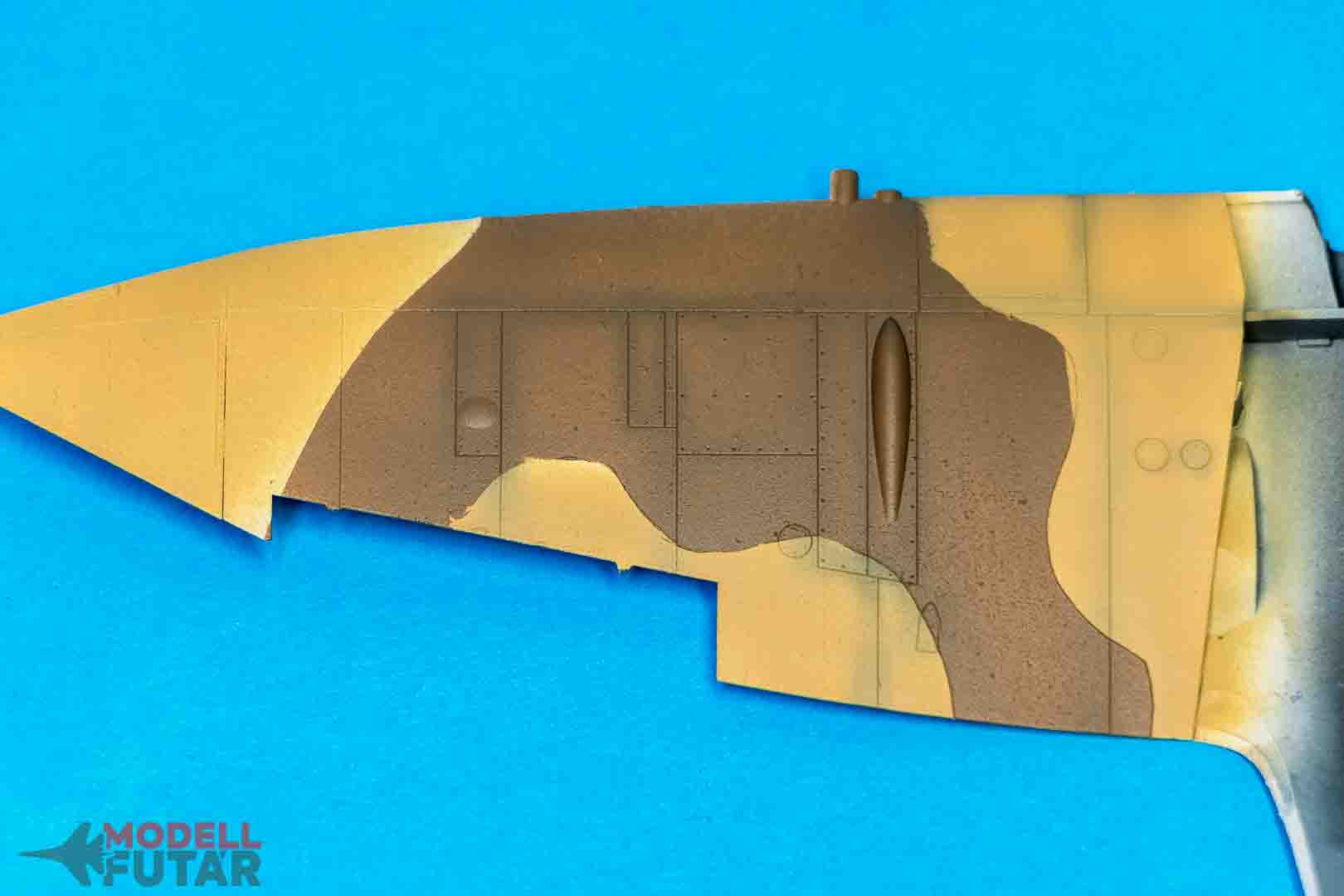 A Spitifre klasszikus sivatagi kamuflázst kapott Dark Erth és Midlestone színekkel. Ahogy látjátok, külön fújtam fel őket. Ökölszabály, hogy mindig a világosabb színnel fújunk először, ami jelen esetben a Midlestone.