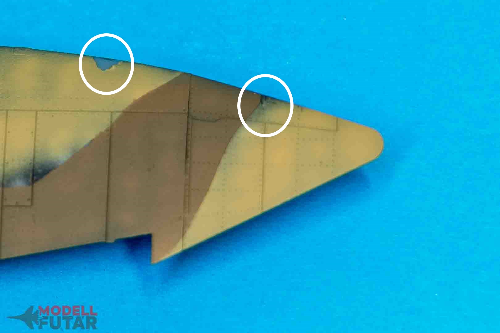 Soha, amióta ezt a fajta alapozót használom, soha nem jött fel a festék és az alapozó a maszkoláskor. Ha megnézitek az alapozós írást, abban ugye leírom, hogy 30 perc alatt fújtam meg azt, úgy. Most a márványos szárny felületen, hosszú csíkokban jött le a festék és az alapozó is. Itt látod. És ezek még a kisebb problémás részek. A csúnyább részeket a lelki egészségünk érdekében nem mutatom meg, elég, ha én nézegetem.